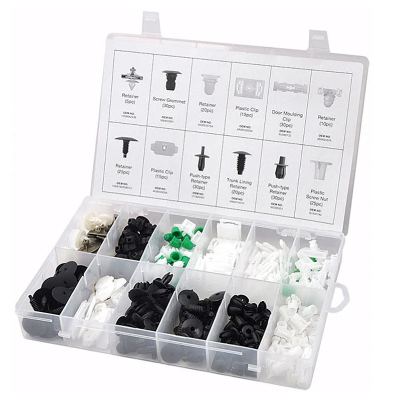 255pcVW Trim Clip Set Assorted body trim clips found on VW vehicles. With a Mixture of : 5 - Round Retaining Clips 20 - Trunk Lining Fir Tree Retainers 25 - Plastic Screw Nuts 30 - Door Moulding Clips 30 - Drive Rivets 30 - Screw Grommets 30 - Plastic Moulding Clips 30 - Push-type Retainers 55 - Retaining Clips